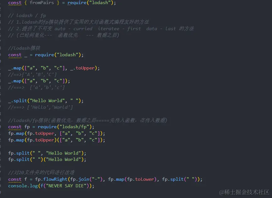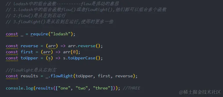 - 比如用lodash函数库中的方法获取数组中的最后一个元素在转换成大写字母:.toUpper(.frist(_.reverse(array)))