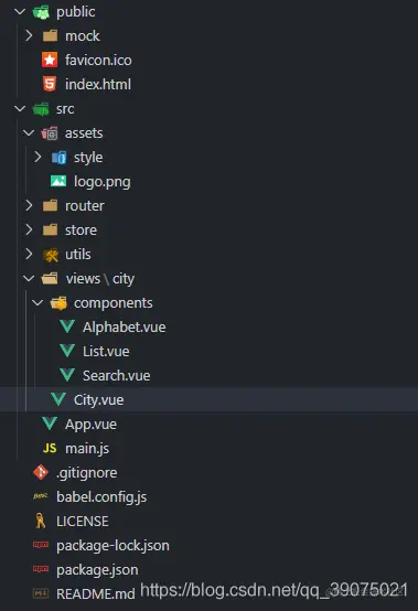 store状态管理配置,里面只定义了一个当前城市的属性 currentCity,用于 List 和 Search 组件共享操作,或者也可以使用 this.$emit 来通知父组件更新。utils里面封装了操作 localStorage 的方法,在 store 配置中引用。views就是用来存放页面和组件的了,每一个页面对应一个自己命名的文件夹,在这里 city 文件夹中创建 City.vue 页面和其组件目录,根据功能简介来分类,我们可以划分为三个子组件:- Search.vue 城市搜索组件