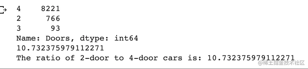 print(df['Doors'].value_counts())ddf = df['Doors'].value_counts()print('The ratio of 2-door to 4-door cars is: {}'.format((df['Doors'].value_counts()[4]/df['Doors'].value_counts()[2])))