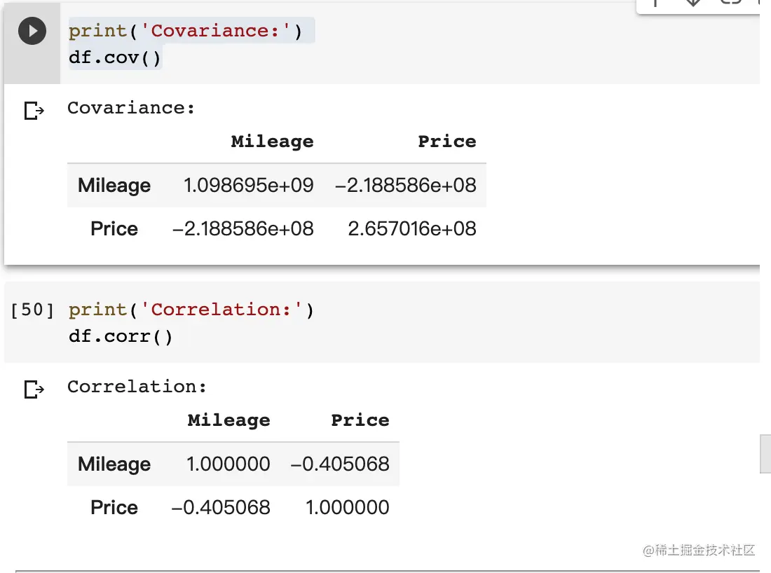 这两个函数会自动排除 NA and null 值的属性。所有只会计算 Mileage 和 price。