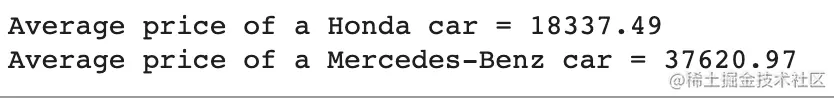 # For Honda:print('Average price of a Honda car = {:.2f}'.format(df.loc[df['Make'] == 'Honda']['Price'].mean()))# For Mercedes-Benz:print('Average price of a Mercedes-Benz car = {:.2f}'.format(df.loc[df['Make'] == 'Mercedes-Benz']['Price'].mean()))
