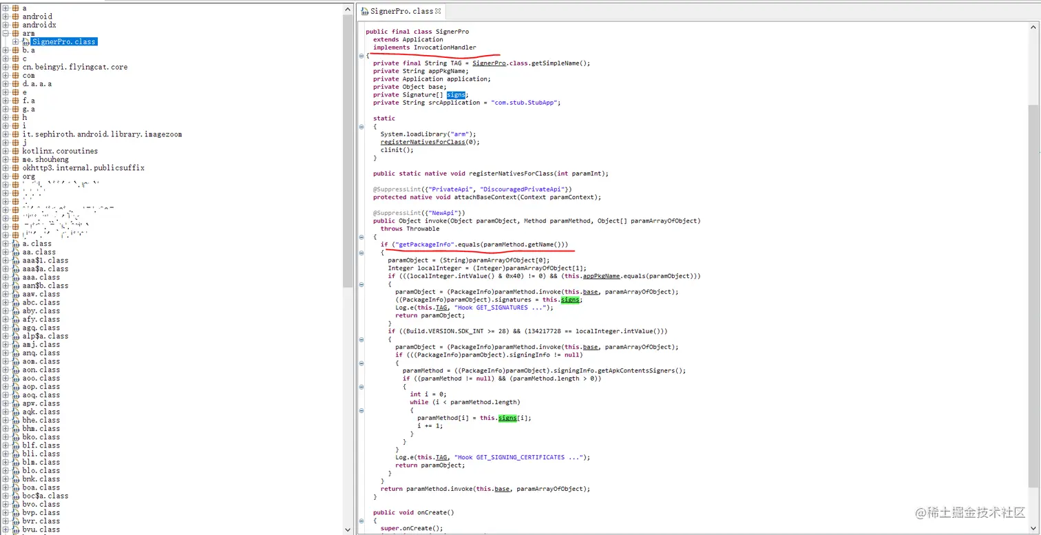 这里的 Application 继承了 InvocationHandler. InvocationHandler 相比大家都不陌生,Retrofit 就是通过在 InvocationHandler 实现的代理来解析请求参数,并根据注解和入参来完成 OkHttp 请求的。我们找到该接口的实现方法 invoke(). 从上图中很明显得可以看出,我们的 getPackageInfo() 方法有很大可能被别人 hook 了。这个方法就是上面说的用来获取应用签名的方法,这里会对 getPackageInfo() 方法进行处理,并返回 signs 作为签名的获取结果而不是应用真实的签名结果。