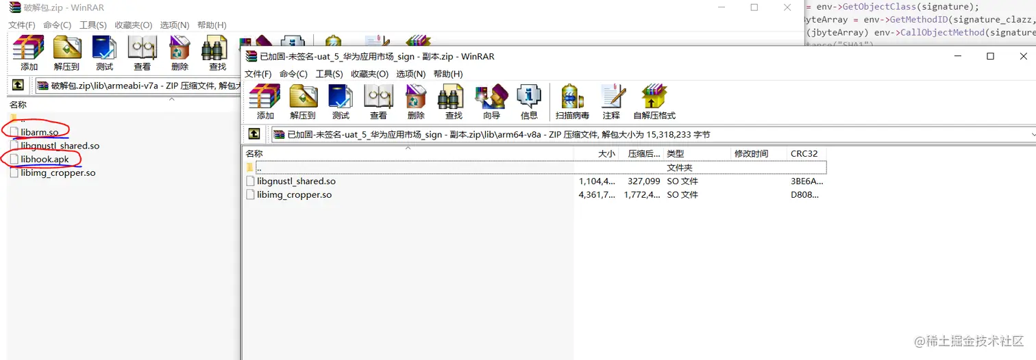 相比于没有破解的包,在 lib 下面多了两个文件,这里的 libarm.so 的内容尚不清楚,这里的 libhook.apk 是一个 apk 文件,并且签名跟我的原始的包的签名一致,但是 apk 内容并不是我的完整包。所以,我猜测这里的 Apk 文件有其他用途,并且仅仅使用签名校验并不安全。因为别人可以读取你的应用的签名,然后通过某种方式进行伪造,让获取签名的方法返回的结果不是安装包真实的签名而是你的真实包的签名。这里的 apk 很有可能就是用来获取签名的。