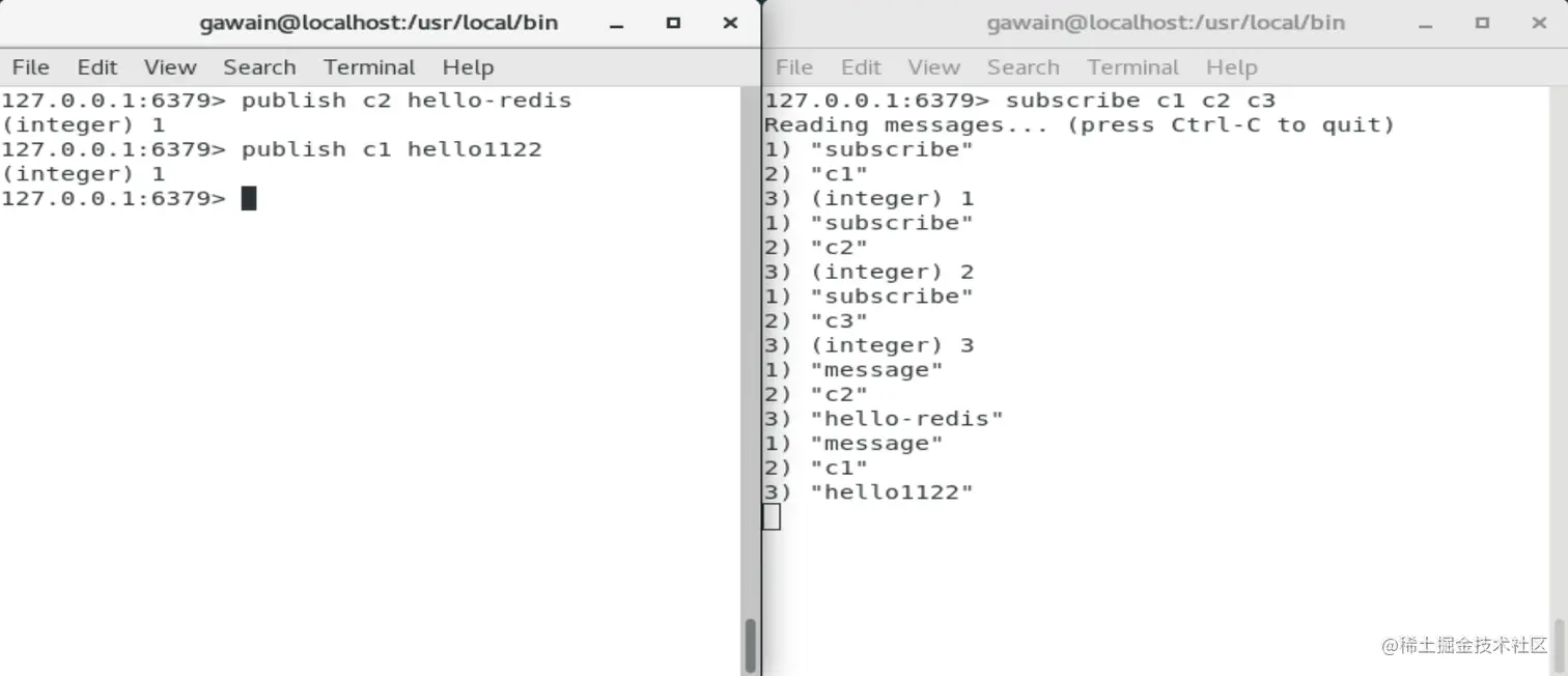- 在另外一个客户端中分别向c2,c1等频道发送消息