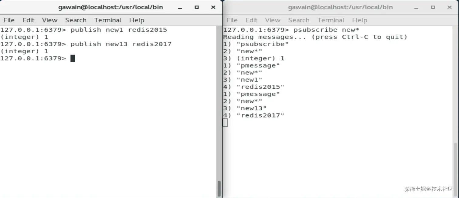 - 在另外一个客户端中分别向new1,new13等频道发送信息