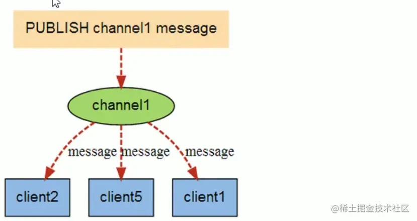 当有新的消息通过publish命令发送给频道channel1时,这个消息就会被发送给订阅它的三个客户端: