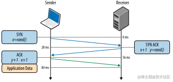 注意:只有在一次完整的 roundtrip 之后 Client 才能开始发送数据;Server 则需要收到 ACK x+1, y+1 消息到达后才能开始发送数据。