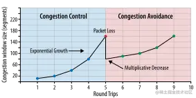 网络条件好的情况下,cwnd会一直倍增,直到其超出接收方系统配置的拥塞阈值窗口大小(ssthres),或出现丢包。此时会触发拥塞避免机制来调整拥塞窗口(cwnd)大小