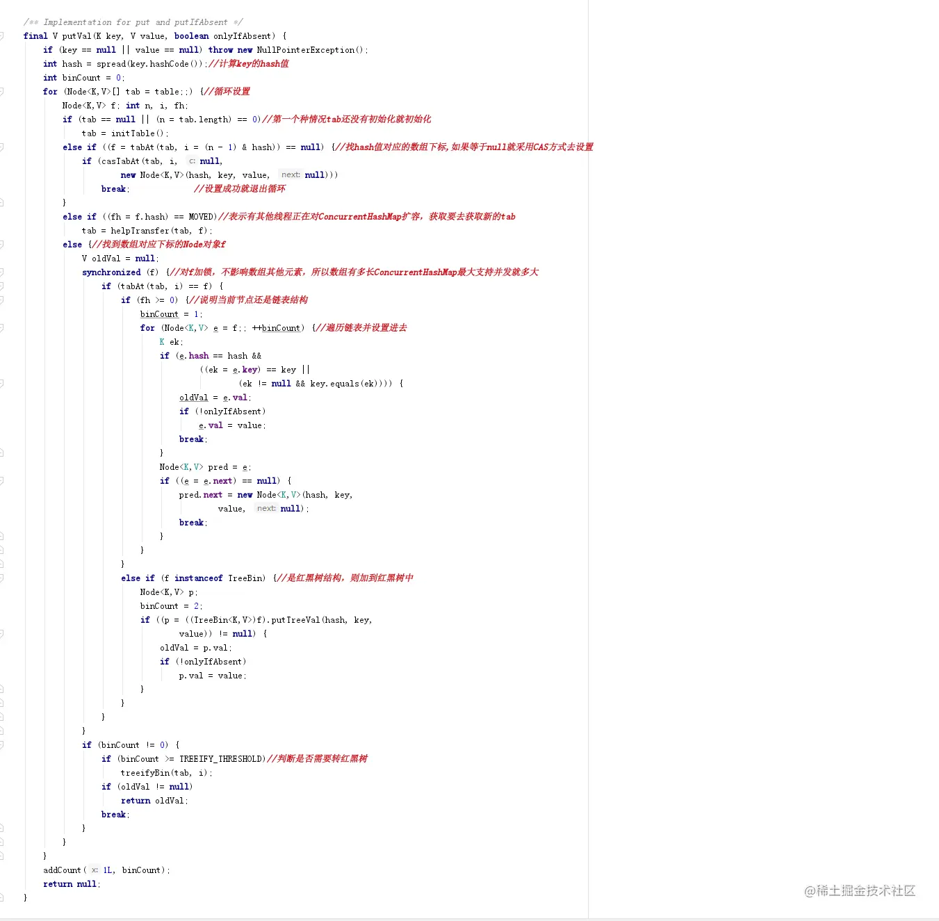 因为jdk7的ConcurrentHashMap的实现已经过时了,所以这里就不详解了,直接看jdk8的实现,put方法依赖putVal方法,所以直接看putVal方法源码与详解如下图: