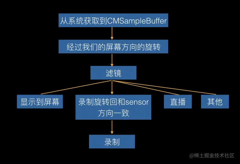 给AVWritter设置一个初始化的Transform,从摄像头过来的CMSampleBuffer直接进入录制流,不要去做屏幕流程。因为不这样的化会出现一个问题。 你点击录制视频,这过程中去旋转屏幕,当你支持四个方向的时候,旋转的时候就会出现闪烁。具体可以用苹果自己的相机试一下就一清二楚了。
