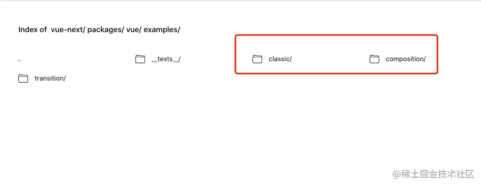 我们可以看到在examples中,有4个文件目录,第一个应该是测试文件相关的东西,我没点开,忽略,后面有3个,分别是 classic / composition / transition ,大概看了下里面的示例代码,transition 应该过渡组件相关的,具体的没细看,就看到两个文件中有transtion 和 transition ; classic 里面和之前vue2的写法差不多的文件,就是有些示例化方式变成由 new --> createApp 之类的 ;composition 里面creatApp 后直接出现了 setup()。纳尼,这是什么东西,赶紧去搜一波。