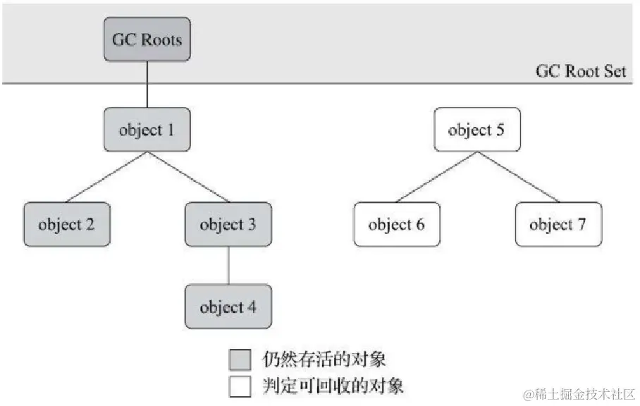 如图3-1所示,对象object 5、object 6、object 7虽然互有关联,但是它们到GC Roots是不可达的,因此它们将会被判定为可回收的对象。