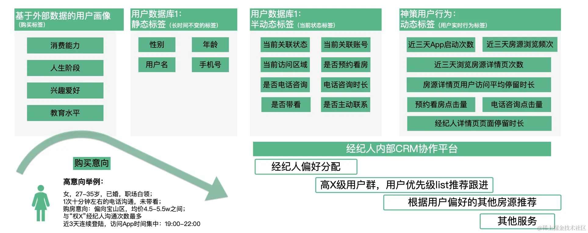 企业 A 通过神策分析及用户画像系统对用户行为数据进行分析,了解用户浏览房源的频次、停留时长和浏览倾向,结合经纪人内部 CRM 协作平台完成客户分配,并根据用户偏好等线索推荐相似房源,赋能经纪人助力成单。