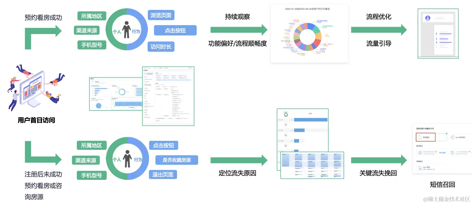 通过神策数据的漏斗分析、归因分析等多维分析模型与用户画像系统实时了解用户来源及路径,并将实时调用的数据反馈给经纪人作为客户跟进的信息补充,助力提升经纪人整体跟进效率;