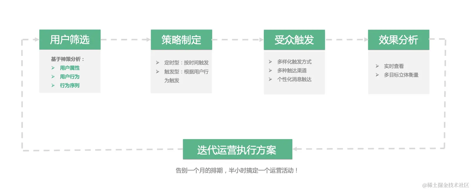 运营动作的落地需要结合神策智能运营系统,在用户不同阶段设置运营计划,牵引用户成长。从筛选目标用户→设置触发条件→用户精准触达→数据实时反馈等,均可自由、快速配置与实现。通过神策自动化运营模板配置触发内容,唤醒沉默用户,及时推送意向楼盘最新信息,持续触达未转化用户,全流程 SOP 保障转化率。