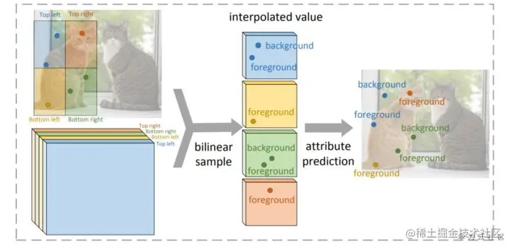 对于Shared Attribute Map,如图8所示。由于要进行分割,需要对前景进行打分。打分的过程根据点的位置分成上下左右四个区域,将不同的区域分配到不同的通道上。推理过程中,为了获取某个点的得分,首先根据点在目标中的相对位置找到对应的通道,而后对该通道的得分进行采样即可得到该点的得分。