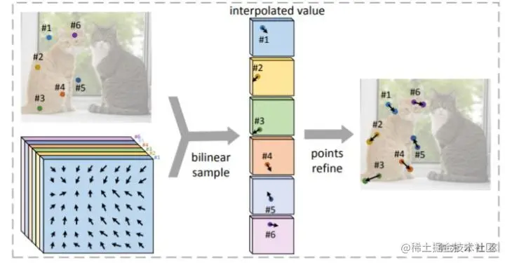 RepPoints对物体轮廓点的偏移量进行修正时(图2),是先基于初始预测的N个轮廓点,通过N个Deformable Conv 算子分别对每个轮廓点进行修正预测,所需复杂度为O(n^2)。该方法对于预测密集点的Dense RepPoints算法而言,在推理效率上就不适用了。Dense RepPoint提出Shared offset fields方法,认为对每个轮廓点的偏移修正特征只需从原始预测的轮廓点信息,即每个轮廓点各自进行独立的修正,从而将复杂度降低到O(n)。具体如图7所示,对每个轮廓点通过bilinear线性插值方法提取特征进行轮廓点修正。