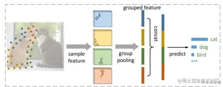 Group Pooling如图6所示,主要解决分类过程中的复杂度。如果实验中采用n点来描述目标,那么将其分成k组,对每组进行池化操作,然后进行预测,最终分类部分的复杂度有O(n)降低到O(k)。