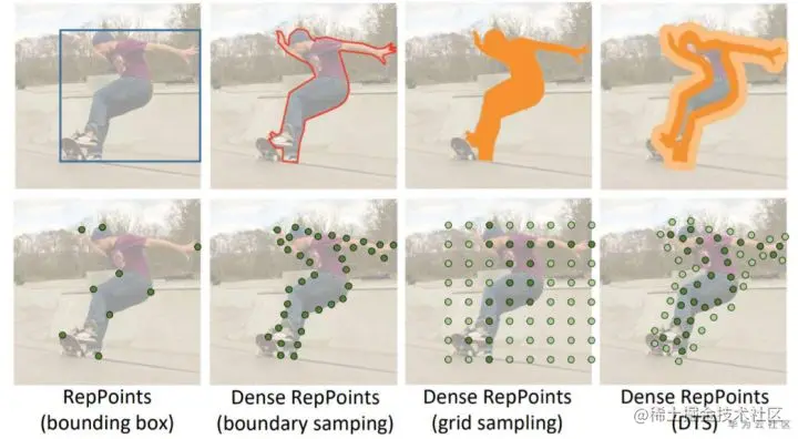 在刻画细粒度的物体几何定位时,有多重表示方式,见图4。其中,基于轮廓的方法(图4 b)对物体的表达更紧凑,需要更多的信息,且由于更关注对物体边缘的分割,有望德大更精确的边缘。而基于网格掩码的方式(图4 c)通过对网格点做前景/背景分类的方式实现物体分割,更易于学习。基于这两种表达的有点,Dense RepPoints采用图4d的边缘掩码方式来表示物体。和轮廓表示类似,边缘掩码表示将点集主要放在物体边缘附近,从而可以更精细地表示物体边缘;另一方面,和网格掩码表示类似,这一方法采用了代表点前景/背景分类的方法来实现物体分割,更利于学习。