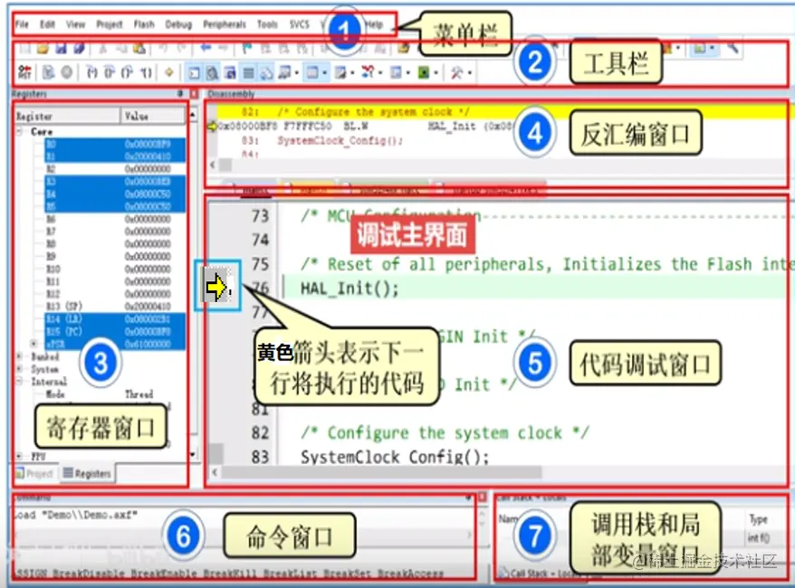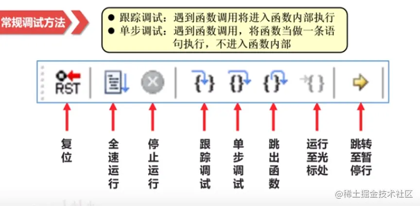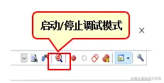 工具栏提供调试模式下的常用功能,包括全速执行、单步执行、断点等调试方法
