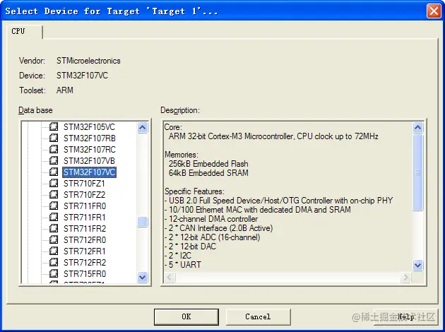 (2) 选择CPU类型为 STM32F107VC (这是MDV-STM32-107开发板采用的CPU类型)