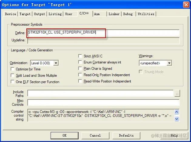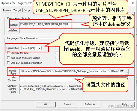 1)添加两个预编译宏 STM32F10X_CL, USE_STDPERIPH_DRIVER(这是ST库用到了这两个宏)