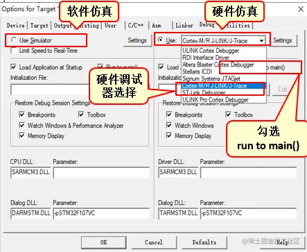 1) 选择硬件调试器(缺省是软件仿真),选择Cortex-M/R J-LINK/J-Trace调试器