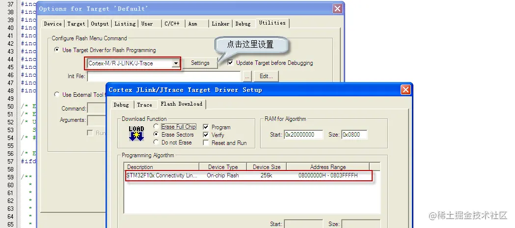 2) 点settings按钮,添加Flash编程算法,选择STM32连接型器件,Flash容量256K字节