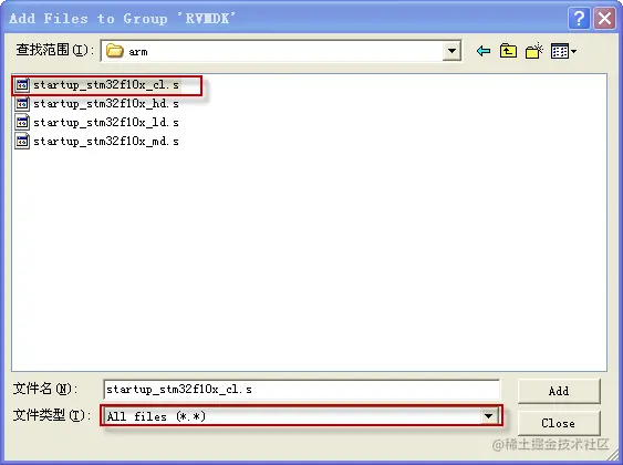 - 给RVMDK文件夹添加文件startup_stm32f10x_cl.s