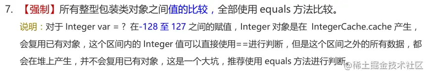 这也就是阿里Java开发手册上说的强制使用equals方法比较整型包装类对象的值: