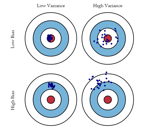 右下:预测数据点既不靠近靶心(高偏差)也不彼此靠近(高方差) 高偏差和高方差都会导致误差增加。通常,高偏差表示拟合不足,而高方差表示拟合过度。既要实现低偏差又要实现低方差是非常困难的——一个通常是以另一个为代价的。