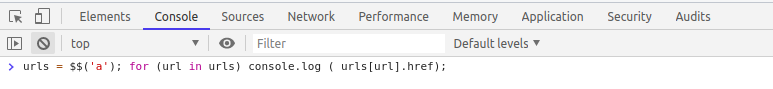urls = $$(‘a’); for (url in urls) console.log ( urls[url].href);