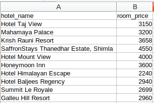 最后一步是将提取的数据存储在CSV文件中。在这里,对于每张卡,我们将提取酒店名称和价格并将其存储在Python字典中。然后,我们最终将其添加到列表中。
