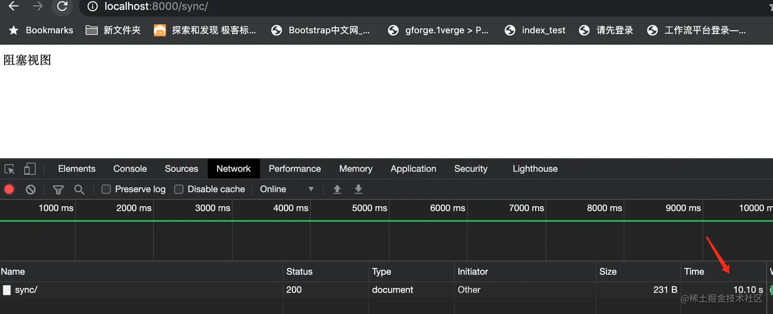 很明显过程中阻塞了10秒,然后我们才等到页面结果: