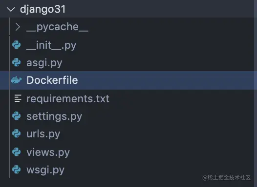 进入项目目录可以发现,熟悉的入口文件mange.py已经消失不见,新增了asgi.py文件用来启动项目,这里我们使用异步服务器uvicorn来启动新版Django,而uvicorn对windows系统支持不够友好,所以使用Docker来构建一个运行镜像,简单方便,进入django31目录,新建Dockerfile: