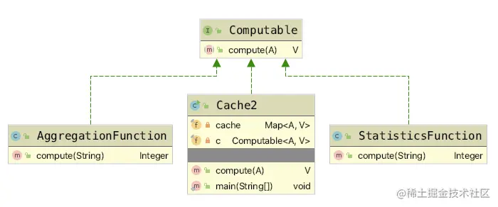 在上面的代码中,我们在一个缓存类里面还实现了计算的功能,显然,这是不合理的。