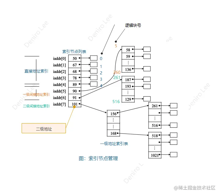 因为物理块每个地址项大小为 4B,磁盘索引块大小为 1KB,即 1024B。而 1024/4 = 256 个,所以一个磁盘索引块可以存放 256 个物理块地址。因此,可以就此推测出一级间接地址索引所对应的逻辑块号范围。 因为每个索引块可以存放 256 个物理块地址,所以第一个一级间接地址索引所对应的逻辑块号范围是 5 ~ 260;第二个一级间接地址索引所对应的逻辑块号范围是 261 ~ 516。具体计算步骤为: 【1】260 = 5 + 256 -1。 【2】516 = 261 + 256 -1。