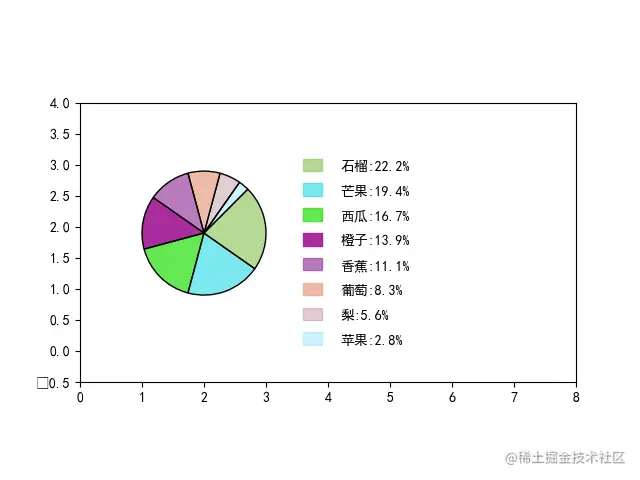 E:\pycharmPro>piePaint.py --items 苹果 梨 葡萄 香蕉 橙子 西瓜 芒果 石榴 --amount 1 2 3 4 5 6 7 8