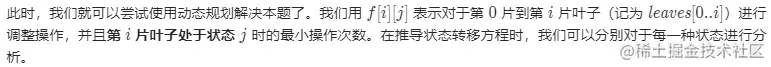 Leetcode错题集 已注销 2020-10-01 88 阅读1分钟 动态规划 LCP 秋叶收藏集 将收藏集中树叶的排列调整成「红、黄、红」三部分。每部分树叶数量可以不相等,但均需大于等于 1。每次调整操作,可以将一片红叶替换成黄叶或者将一片黄叶替换成红叶。求最小调整操作次数。 动态规划对f[i][0],f[i][1],f[i][2]进行求解 要注意f[i][j] 当i<j时为不满足条件,因此为无穷大