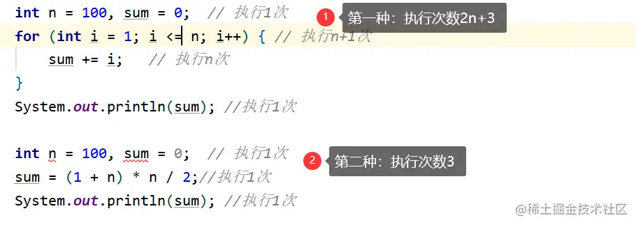 两个算法的第一行和最后一行语句一样,所以我们关注中间部分。我们把循环看做整体,忽略头尾循环判断的开销,那么这两个算法其实就是n次和1次的差别。