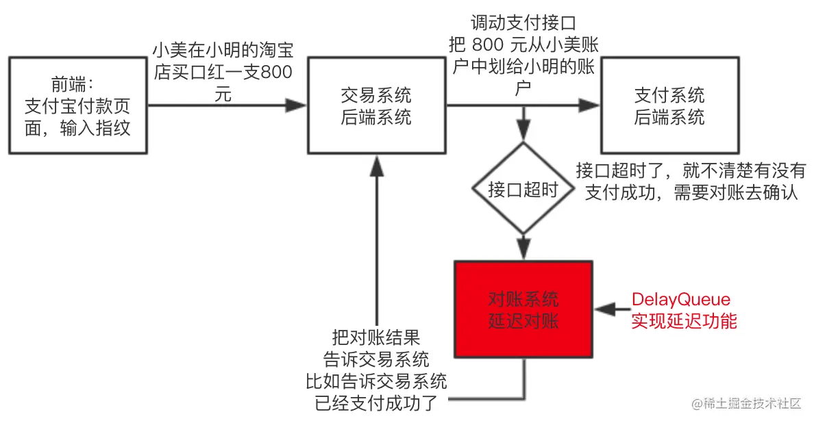 交易调用支付的接口,这个接口的作用就是为了把小美的 800 元转给商家小明; 接口调用超时,此时交易系统并不知道 800 有没有成功转给小明,当然想知道的方式有很多,我们选择了对账的方式,对账的目的就是为了知道当前 800 元有没有成功转给小明; 延迟对账的目的,因为支付系统把 800 元转给商家小明也是需要时间的,如果超时之后立马对账,可能转账的动作还在进行中,导致对账的结果不准确,所以需要延迟几秒后再去对账; 对账之后的结果有几种,比如已经成功的把 800 元转给小明了,这时候需要把对账结果告诉交易系统,交易系统更新数据,前端就能够显示转账成功了。 在这个案列中,延迟对账的核心技术就是 DelayQueue,可以这么做:新建对账任务,设置 3 秒之后执行,把任务放到 DelayQueue 中,过了 3 秒之后,就会自动执行对账任务了。