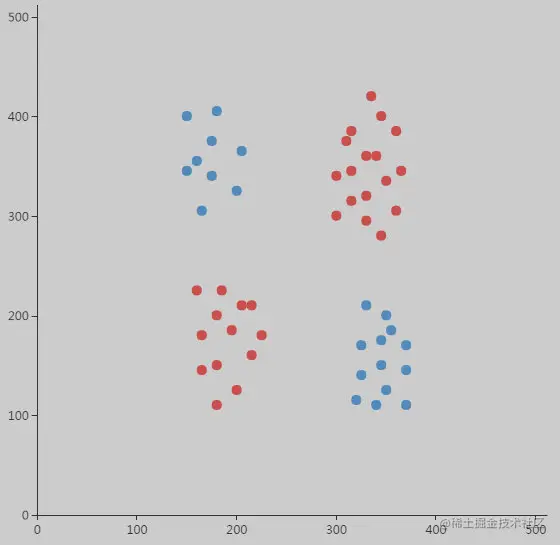 在介绍核函数之前,我们先来看一个问题,这个问题在机器学习的历史上非常有名,叫做亦或问题。我们都知道,在二进制当中有一个操作叫做亦或操作。亦或操作其实很简单,就是如果两个数相同返回的结果就是0,否则就返回1。如果我们的数据是类似亦或组成的,就会是这样一个形状: