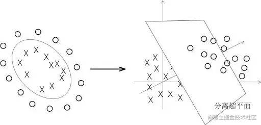 那如果我们把上面的数据映射到更高的维度当中,上图是二维的图像,我们把它映射到三维当中,就可以使用一个平面将样本区分开了。也就是说通过一个映射函数,将样本从n维映射到n+1或者更高的维度,使得原本线性不可分的数据变成线性可分,这样我们就解决了一些原本不能解决的问题。