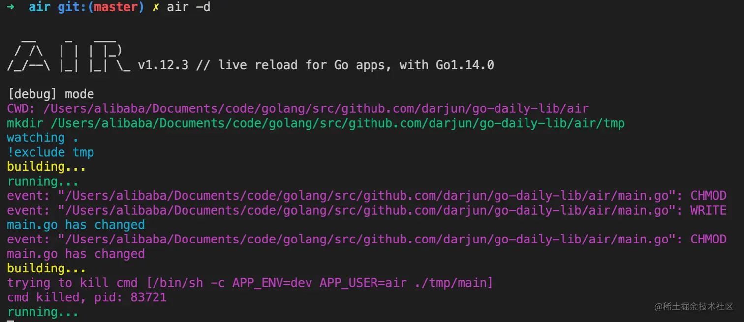 air会自动编译,启动程序,并监听当前目录中的文件修改: