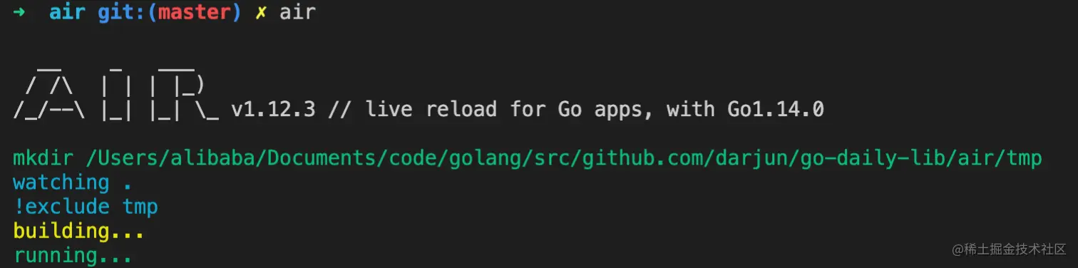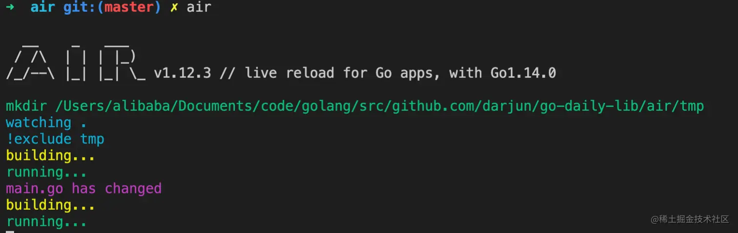 上面的命令会在$GOPATH/bin目录下生成air命令。我一般会将$GOPATH/bin加入系统PATH中,所以可以方便地在任何地方执行air命令。