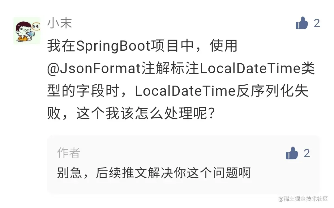 最近,有个小伙伴问我:我在SpringBoot项目中,使用@JsonFormat注解标注LocalDateTime类型的字段时,LocalDateTime反序列化失败,这个我该怎么处理呢?别急,我们一起来解决这个问题。