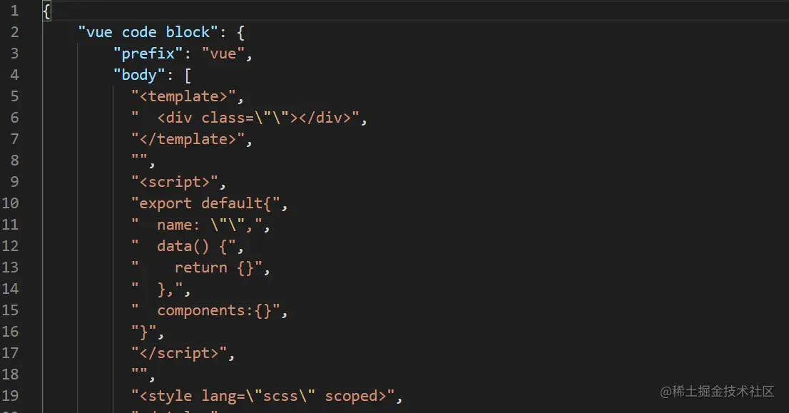 vscode自定义代码块 心沉 2020-10-02 454 阅读1分钟 1.进入Visual Studio Code编辑器 2.选择(文件>首选项>用户片段) 3.输入选择vue.json 将自定义的代码块放在body里面,需要更改成对应的格式 对于内容比较多的代码片段,可以使用snippet generator这个工具 (PS:直接百度搜索) 左边放入需要自定义的代码片段,右边会自动生成更改后的代码格式 然后将更改后的代码放到vue.json里面的body中就完成啦 这里是我配置后的vue.json 这里是输入vue按回车生成的代码