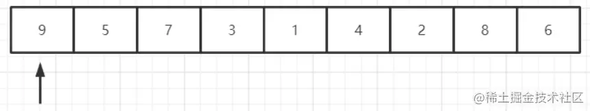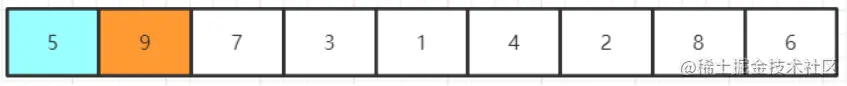 指针先指向第一个元素,比较当前元素与下一个元素,发现9比5大,那么交换二者