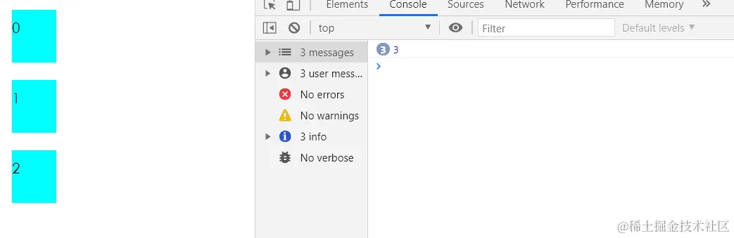 在这个案例中我们首先给div绑定了事件,我们想获得被点击的div的索引。按照惯例,我们点击div就会获取当前循环的i,也就是0、1、2,然而当我们运行时却发现事实并非如此