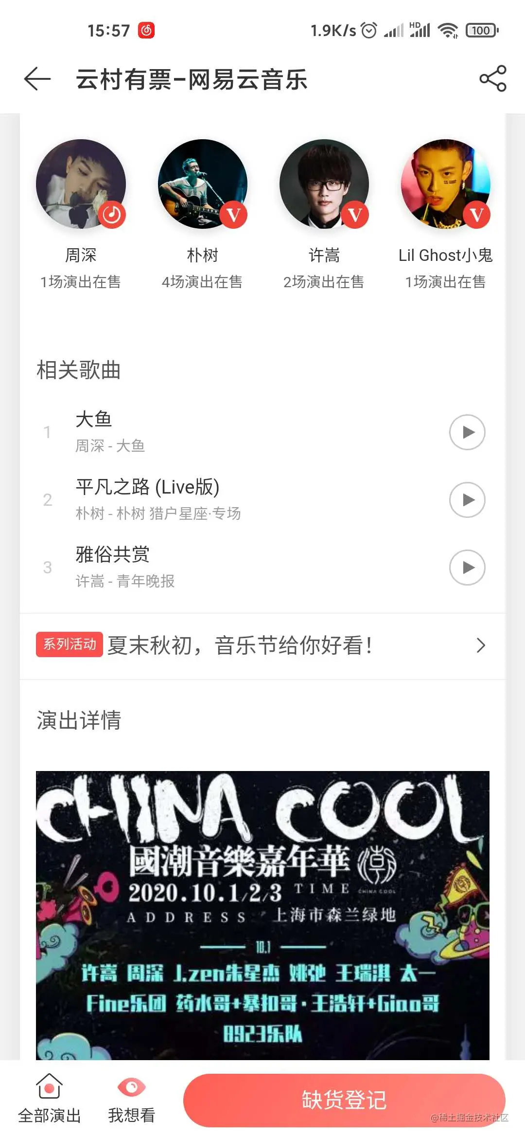 话说上上周的某天下午,我躺在床上百无聊赖的在听许嵩的雅俗共赏(网易云少数百万评论歌曲之一),忽然看到歌曲评论区置顶的是许嵩的十月一演唱行程,他居然要来上海参加国潮音乐节!!!!